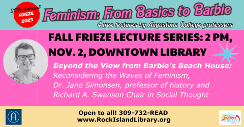 Please join us for the 26th Annual Frieze Lecture Series where we will focus on the theme "Feminism to 2023: From Basics to Barbie". This free community lecture series is made possible through partnership with Augustana College. Upcoming topics and speakers: